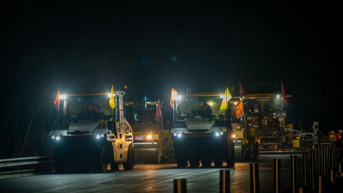 施工現(xiàn)場采用了智能攤鋪碾壓技術,通過加裝在攤鋪機、壓路機上的北斗高精度定位系統(tǒng)、慣性導航系統(tǒng)和可視化等智能技術,實現(xiàn)了24小時協(xié)同作業(yè),與傳統(tǒng)路面攤鋪相比,施工效率提高了33%。而且在智能化的加持下,更實現(xiàn)自動變道、自動避障,碾壓精度控制在0.5cm。
