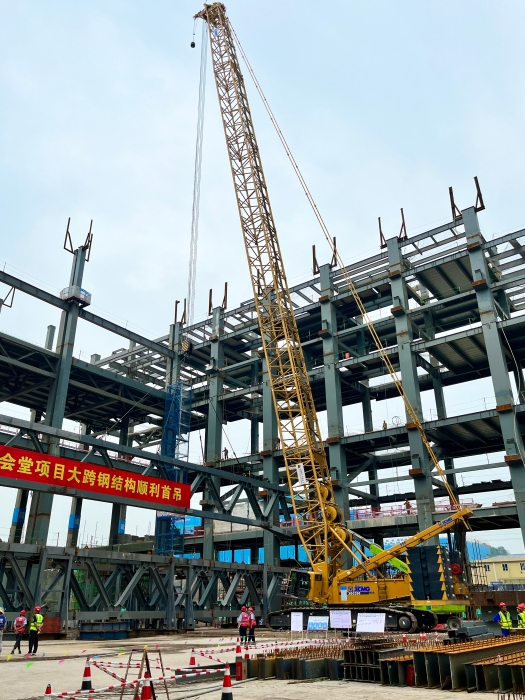 這里是西部(重慶)科學(xué)城鋼結(jié)構(gòu)科學(xué)會(huì)堂工程現(xiàn)場(chǎng),近日,該工程迎來了重要節(jié)點(diǎn),在數(shù)雙目光的注視下,兩臺(tái)黃色身影仿佛“心有靈犀”,經(jīng)過緊密配合,西南地區(qū)首例72米大跨度鋼桁架緩緩吊裝就位……