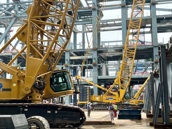 據(jù)該項(xiàng)目的相關(guān)負(fù)責(zé)人介紹,本次吊裝的72米大跨度鋼桁架重約160噸,因其長(zhǎng)度特殊的原因,使用一臺(tái)履帶起重機(jī)無法完成吊裝作業(yè),項(xiàng)目方在衡量履帶起重機(jī)產(chǎn)品吊重能力、穩(wěn)定性、安全性等多方面后,決定使用兩款徐工XGC350履帶起重機(jī)搭配72米主臂工況,采取“原位拼裝+雙機(jī)抬吊”的吊裝手法完成本次施工。