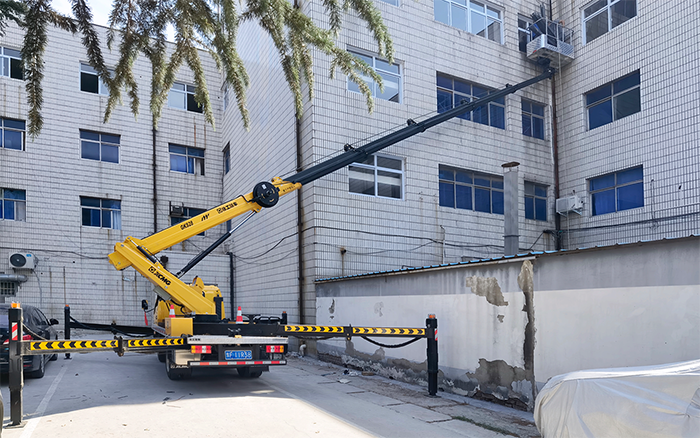 在現(xiàn)場(chǎng)可以看到,GKS28D結(jié)構(gòu)緊湊,整車尺寸小,能在小區(qū)狹窄道路內(nèi)穿梭自如;作業(yè)斗將鋼架物料和一名施工人員平穩(wěn)快速運(yùn)送至起始作業(yè)點(diǎn)位,從右至左依次安裝鋼架,設(shè)備作業(yè)幅度覆蓋整排樓體外立面,可輕松到達(dá)指定位置;同時(shí),無(wú)線遙控器能夠幫助檢修人員“無(wú)死角”觀察到作業(yè)平臺(tái)位置,大大提高了移動(dòng)效率和精準(zhǔn)度。