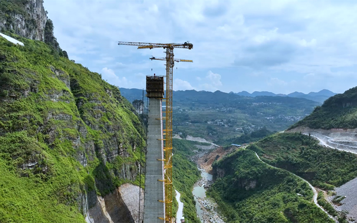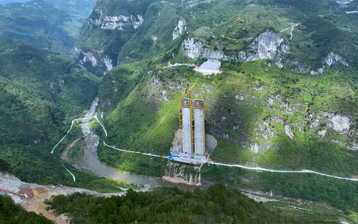 金旗特大橋是世界上目前在建最高的深山峽谷連體斜拉橋,主塔總高度達(dá)300.5米,施工區(qū)域多喀斯特地貌,地下巖層脆弱、兩岸山體陡峭、施工區(qū)域狹窄、轉(zhuǎn)運(yùn)困難,其長度、塔柱高度、施工區(qū)域地形地貌均為國內(nèi)罕見的高難度。
