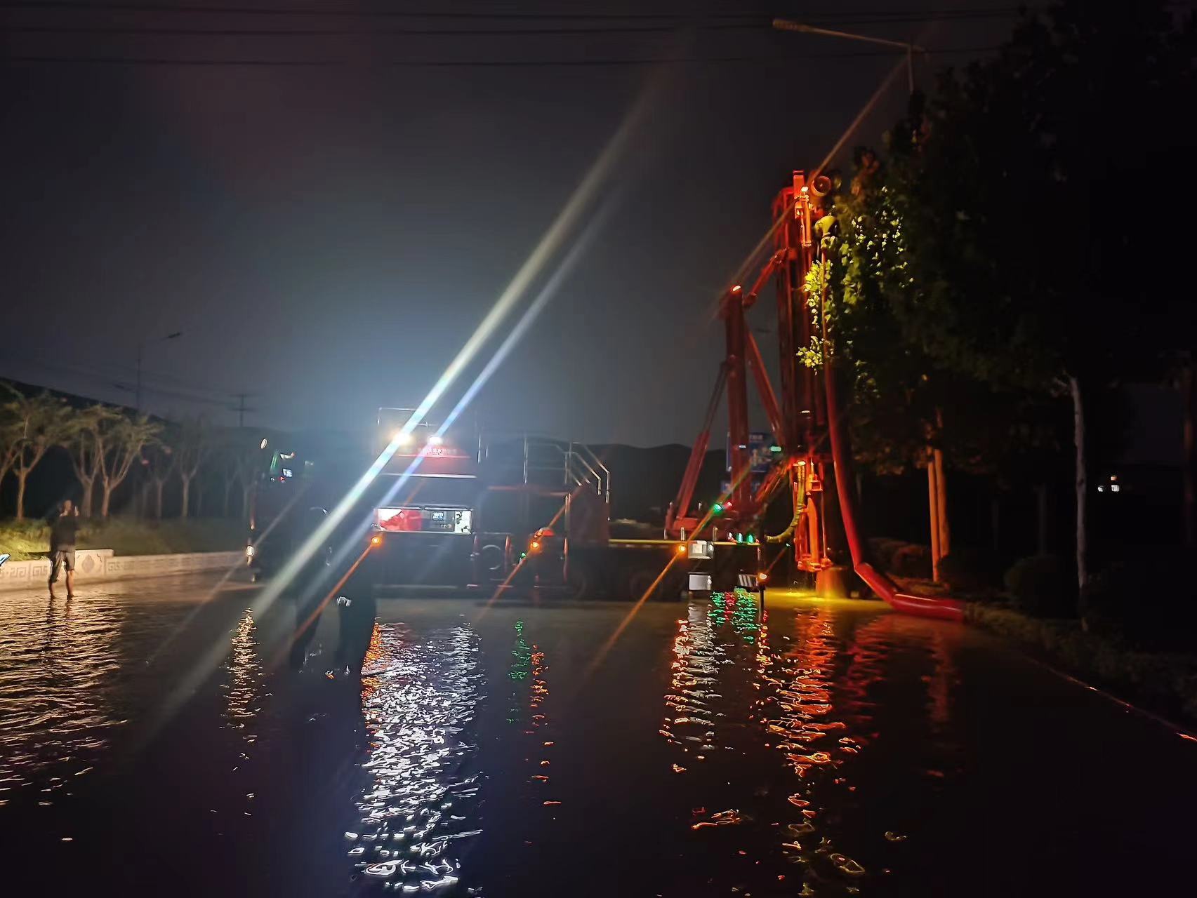 據(jù)悉,趕往此地需經(jīng)過(guò)一段深約1米的積水路段,普通救援車輛難以到達(dá),徐工垂直式排水搶險(xiǎn)車GP35C憑借硬核涉水能力順利通過(guò),于晚上8時(shí)率先抵達(dá)現(xiàn)場(chǎng)。短暫準(zhǔn)備后,救援人員采用垂直車輛臂架,將水泵放入窨井中抽排水的救援方案,水帶蜿蜒90米,將積水排入附近河道。