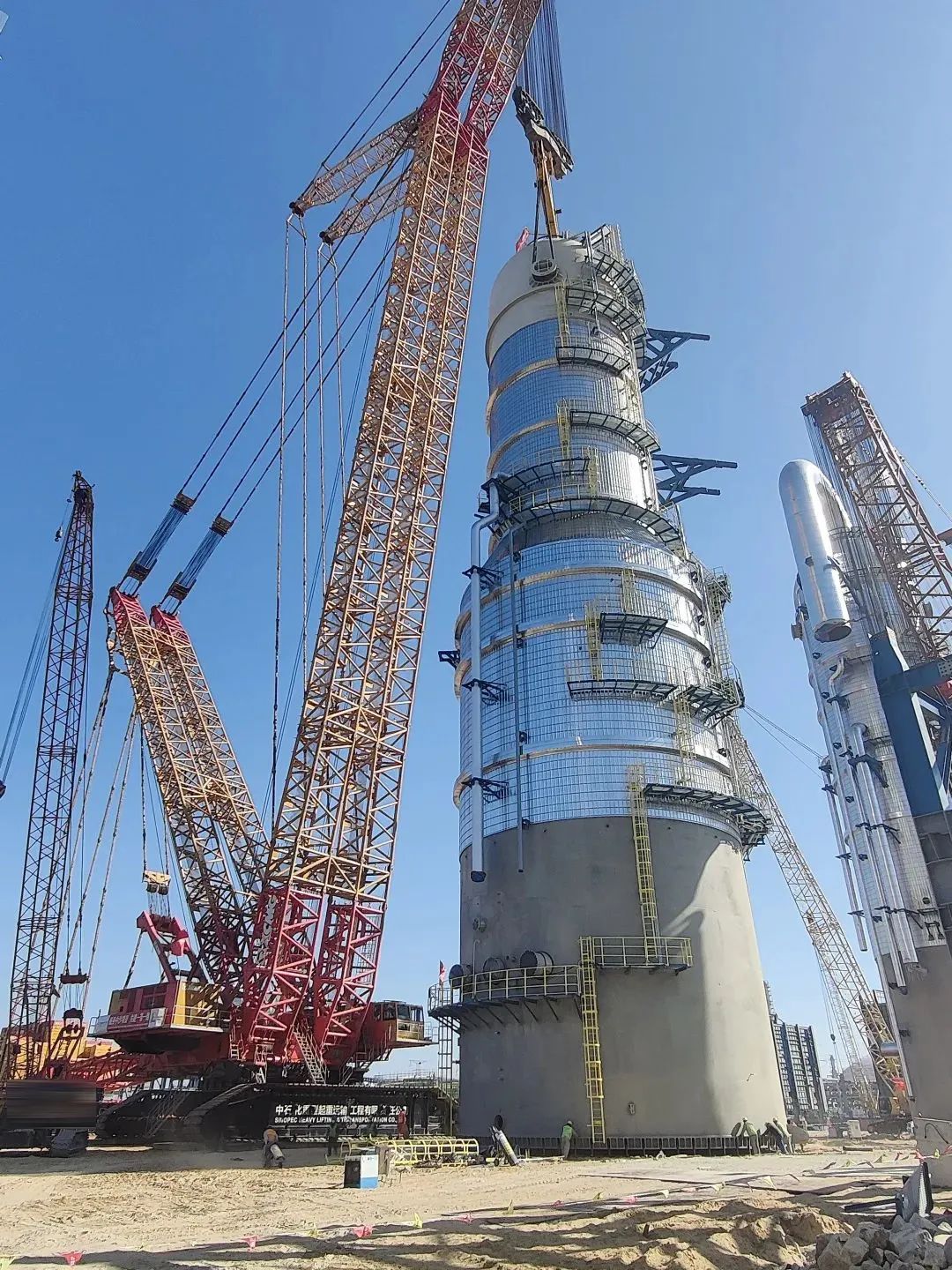 施工現(xiàn)場,XGC88000和XLC17000將“穿衣戴帽”后,總重量達(dá)2000噸的急冷水塔設(shè)備平穩(wěn)吊起并準(zhǔn)確放置到預(yù)定位置,全程行云流水、一氣呵成,僅僅耗時三小時。