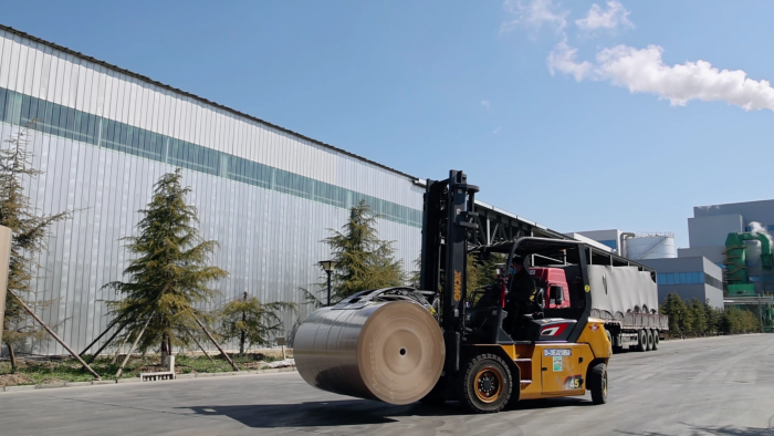十幾臺(tái)徐工孔雀系列電動(dòng)平衡重叉車搭配紙卷夾屬具穿梭忙碌