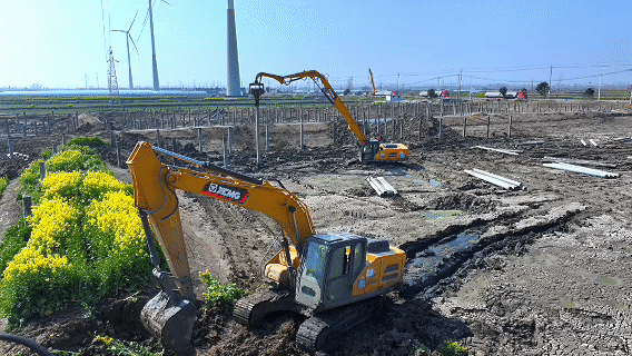 在揚州178兆瓦光伏施工現(xiàn)場,徐工XE300GP打樁機正演繹著現(xiàn)代工程機械的超強實力——機械臂精準起落間,10米預制樁以平均57s/根的節(jié)奏植入地層,樁基垂直度監(jiān)測儀實時顯示±5厘米的精度數(shù)據(jù)。