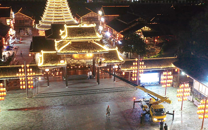 在以 “非遺傳承” 為定位的廣西某文旅小鎮(zhèn)亮化工程中,徐工 C 系列 GKS28 高空作業(yè)車憑借出色性能,成為施工關(guān)鍵力量。