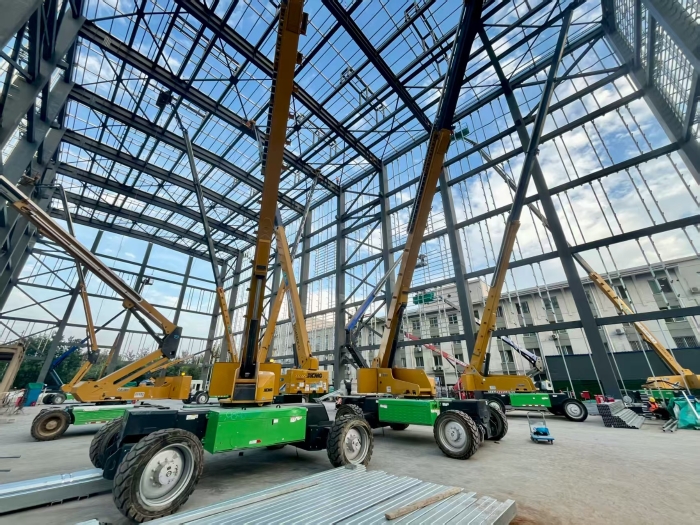 多臺(tái)設(shè)備組成的"綠色戰(zhàn)隊(duì)"展現(xiàn)出強(qiáng)大的協(xié)同作業(yè)能力,其靈活的轉(zhuǎn)向模式和強(qiáng)大的通過(guò)性在密集的鋼構(gòu)件中穿梭自如,大幅提升了焊接安裝的效率,為這項(xiàng)重點(diǎn)工程的順利推進(jìn)提供了強(qiáng)有力的高空保障。